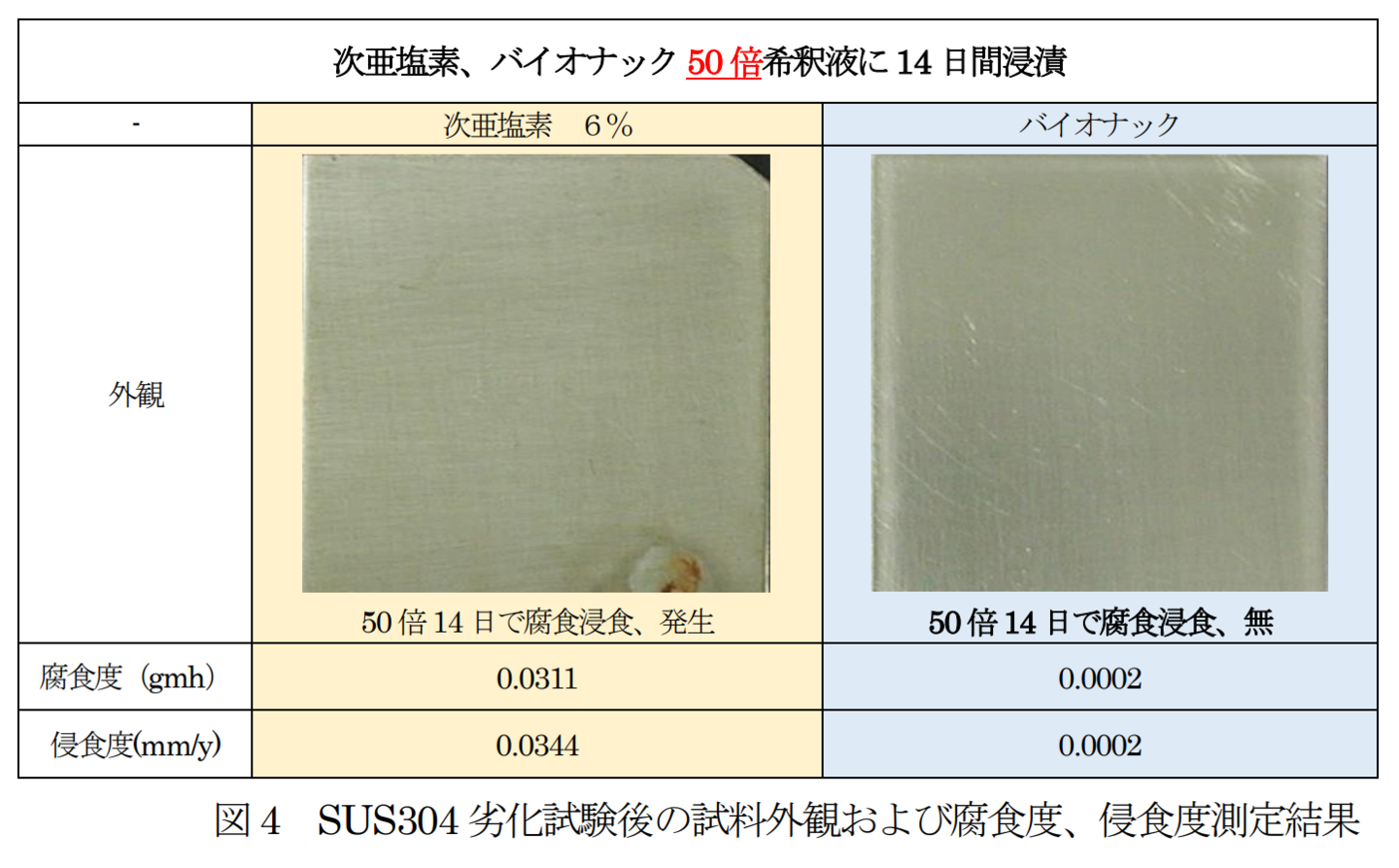 ※ステンレスの腐食試験の詳細はこちら→ バイオナックと次亜による 09_SUS(ステンレス)腐食耐久試験.pdf